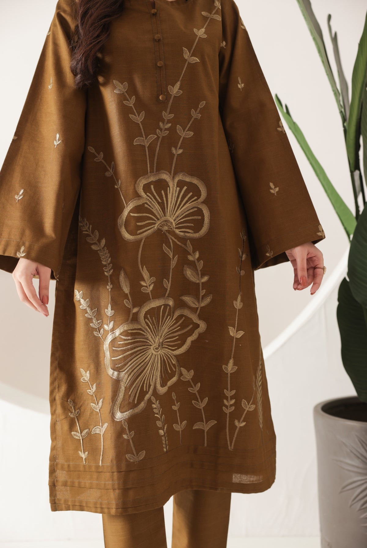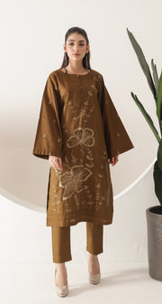 Product Details Embroidered Two Piece  Shirt: Embroidered Shirt Trouser: Dyed Plain Trouser Fabric: Khaddar