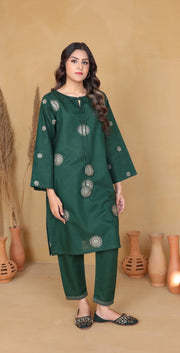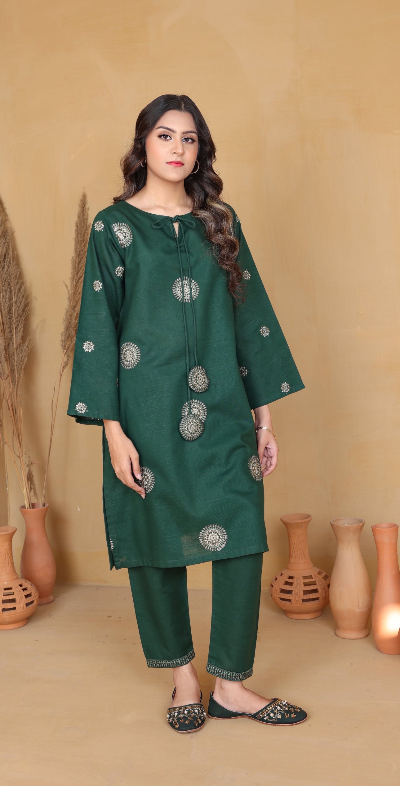 Product Details Embroidered Two Piece  Shirt: Embroidered Shirt Trouser: Dyed Plain Trouser Fabric: Khaddar